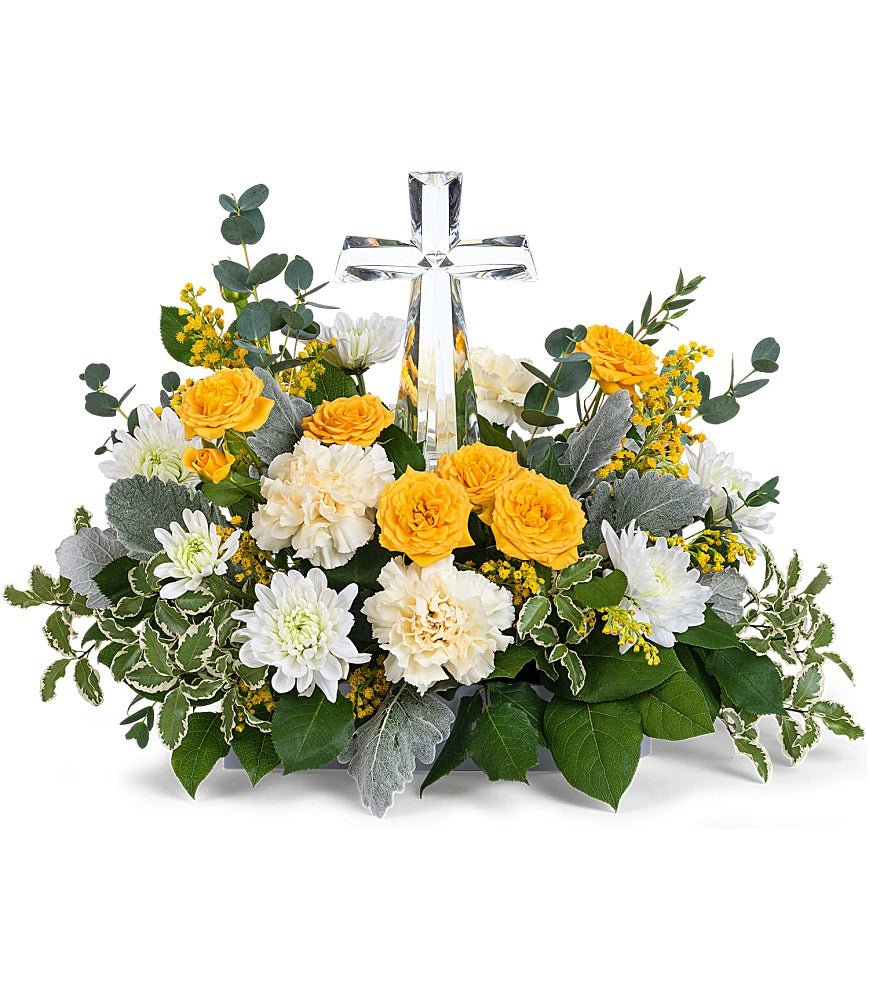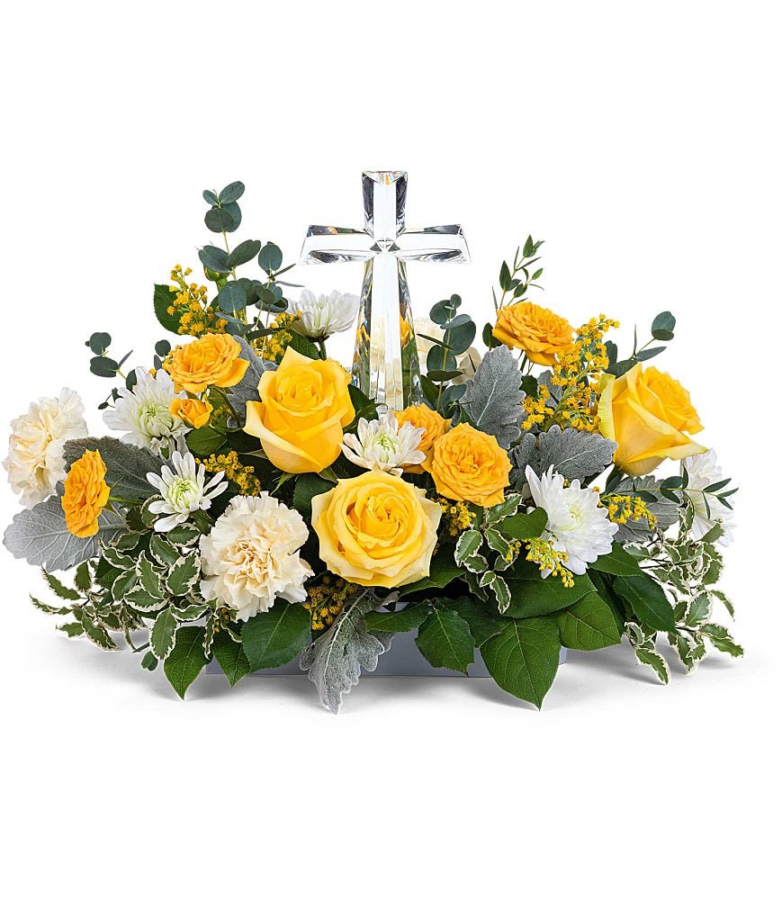 Be the Light Bouquet features beautiful yellow roses that are accented by white flowers and dusty greenery. A keepsake crystal cross sits amid the flowers, a symbol of love, light, and strength. The one-sided bouquet is designed in a low dish to sit on a table or pedestal. Be the Light Bouquet is a gift that celebrates Easter. Or send light to someone in need to remember a loved one lost.