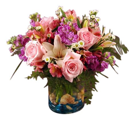 It's Summertime which means it's time to hit the beach! We've captured all of the excitement in this beautiful arrangement. Cylinder vase includes colored ocean water gemstones and actual seashells! Pink and lavender flowers capture the shades of a beach sunset. Can be used as a centerpiece or simply to brighten someone's day!