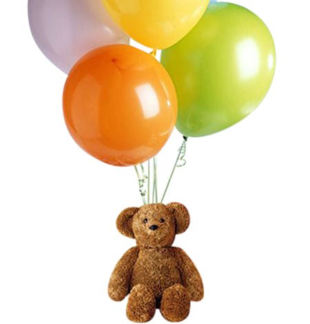 Soft and cuddly teddy bear with assorted color latex balloons attached. A great value! The combination of colorful latex balloons and an adorable teddy bear is an excellent gift for any celebration or get well occasion. This precious gift will instantly bring a smile to a child of any age.