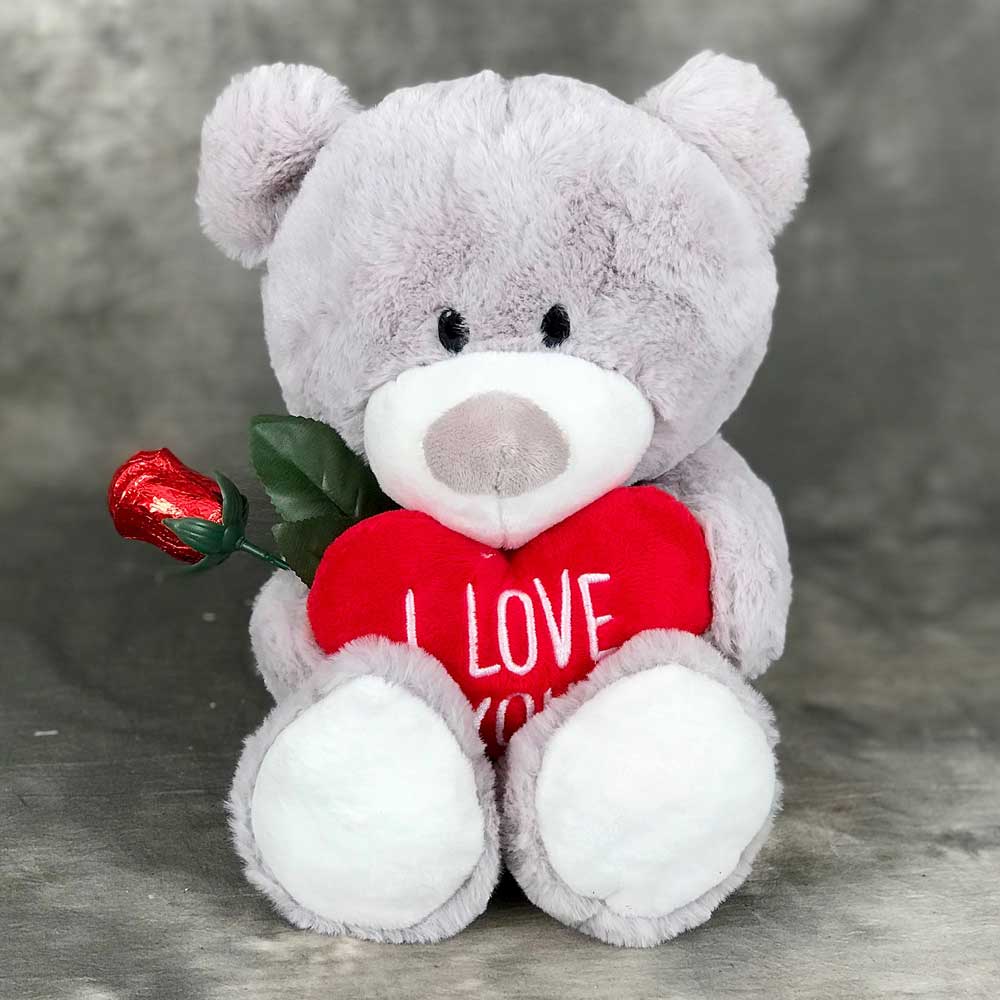 Your sweetheart will love this sweet treat for Valentine's Day. Soft and waiting to be hugged, this adorable plush teddy bear comes hugging a delicious, chocolate rose.