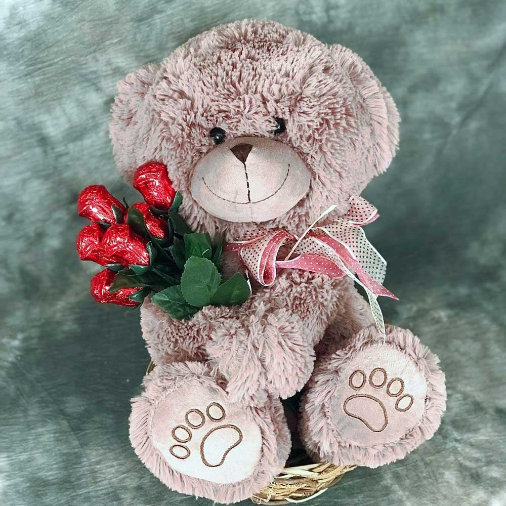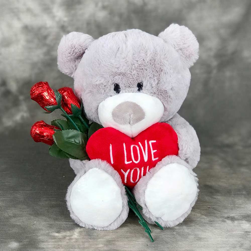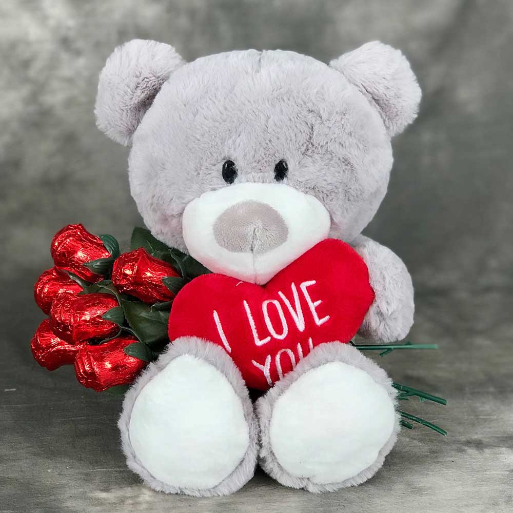 Beary Sweet brings hugs and sweet kisses to the recipient. The adorable teddy bear clutches sweet and savory chocolate roses. Available with 1, 3 or 6 roses.
