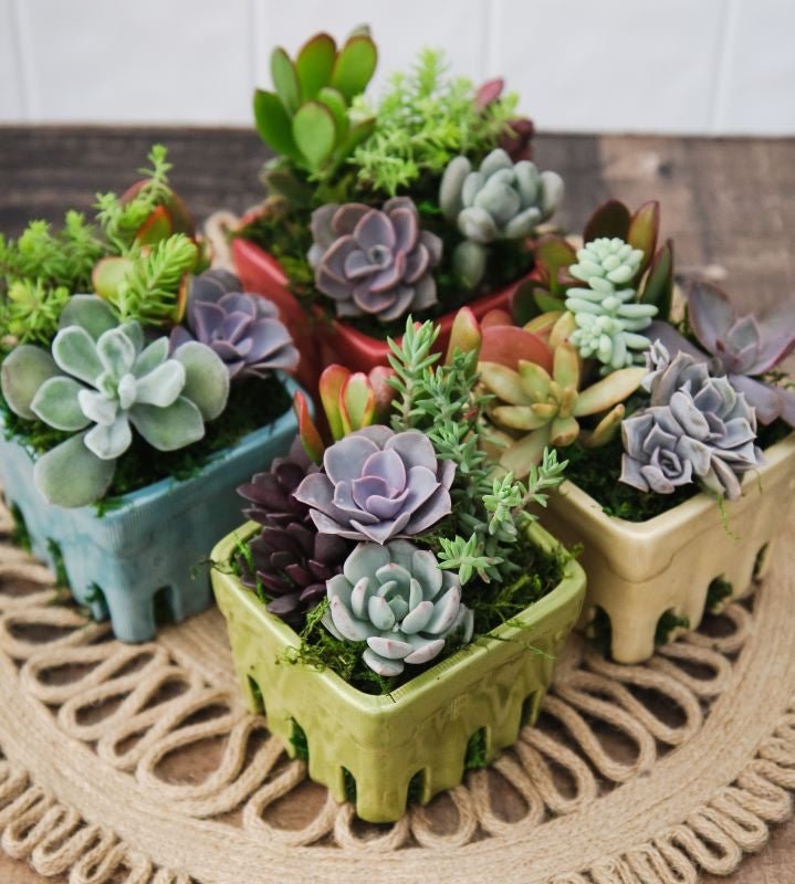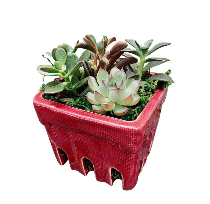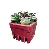 Berry sweet and stylishly succulent! This petite decor accessory is designed to complement and accent any interior decor style. Whether placed on the desktop in the office or on the countertop in the kitchen, its simplicity and sweetness catches the eye of all who see. An adorable 4 inch ceramic berry basket holds a stunning collection of unique and delightful succulents bringing an organic, earthy style into any room!