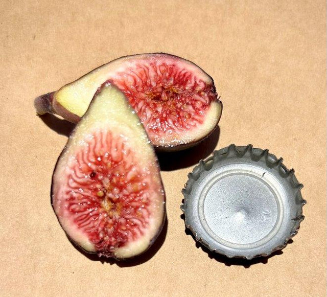 Black Celeste is a small, drop shaped fig. It gets its name from its dark black skin and red pulp. Its skin can even have a bluish tint to it sometimes. Black Celeste has a very sweet flavor. The variety is known to be hardy and grows on trees with 3 and 5 lobed leaves.