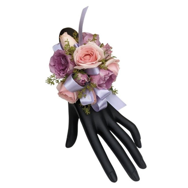 The Blush Beauty Corsage combines lavender and pink flowers and worn on the wrist for dances, proms and weddings.