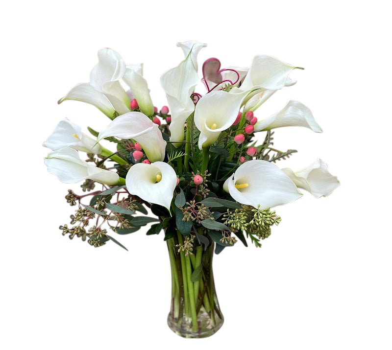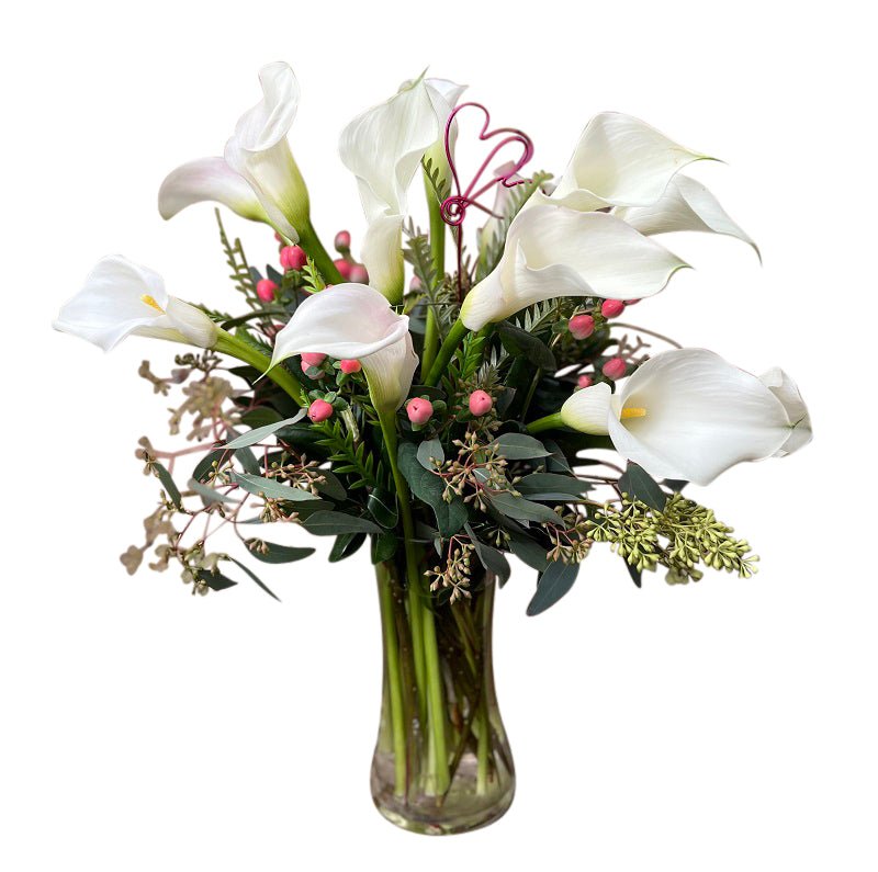 Calla lilies have been a popular choice lately for all occasions. These classy stems have beautiful white blooms. Designed in a glass cylinder vase with premium greenery such as seeded eucalyptus, this bouquet is also accented with pink hypericum berry.