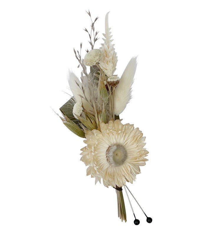 Light and casual, the Boho Dried Flower Boutonniere adds effortless elegance to your sport coat or suspenders. Earthy grasses and natural pods bring the best nature has to offer to your wedding or prom look.
