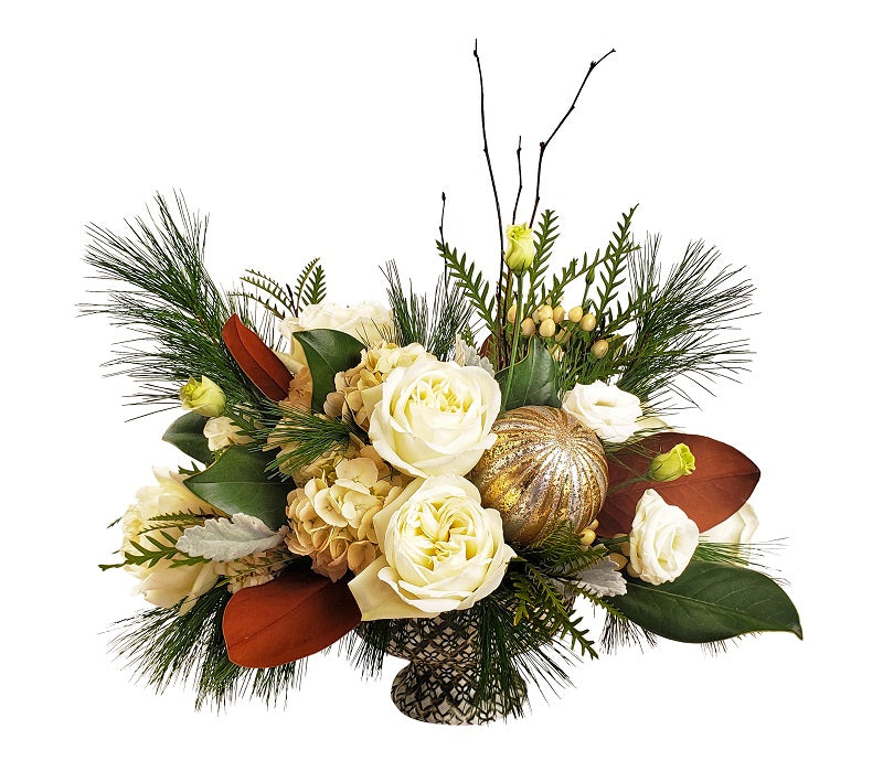 Boho Holiday Centerpiece is made with fresh and earthy evergreens. The mix of spiky textures and draping shapes instantly makes Boho Holiday an interesting centerpiece to gather around. Elegant white flowers like tulips, roses, mini carnations, and lilies are clustered together in Boho Holiday. The design is finished with some of nature’s most fascinating accents like pinecones, seeded eucalyptus, and plants. Painted silvery leaves tie the flower arrangement together with its mercury glass pedestal vase. The vase adds a touch of vintage shine to the design. Boho Holiday Centerpiece is a contemporary choice for the friend or relative with artistic style. Send Boho Holiday to set the scene for the coziest holiday soiree.