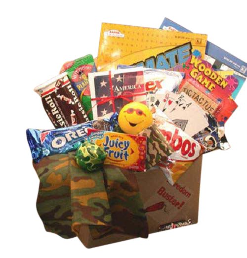 The Boredom Buster is a gift basket of snacks, games, puzzles and more to help pass the time.