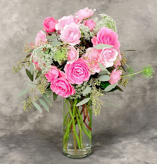 In honor of Breast Cancer Awareness Month, this all pink beautiful bouquet is great for any occasion. Gorgeous spray roses are the focal point with decorative fillers and greens in a sleek and modern cylinder container.
