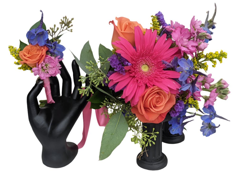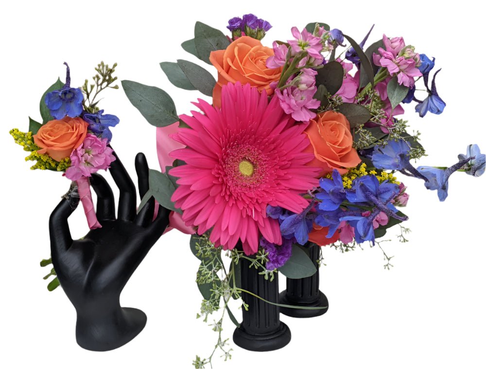Go with the prom flower package that has a lot of pop! Matching clutch bouquet and boutonniere in vibrant, bright colors!