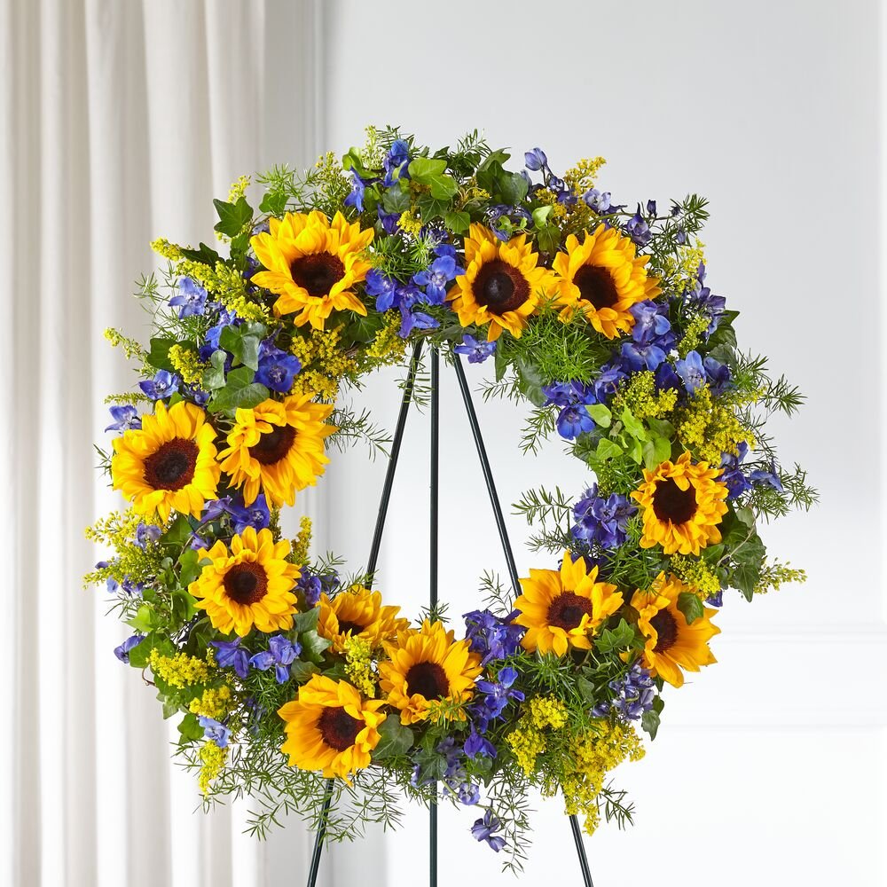 Sunflowers, delphinium, and fresh greenery are designed in a loose and natural style in the Bright Rays Wreath. The yellow and blue colors contrast to create a pleasing and uplifting color palate. Bright Rays Wreath is displayed on a tall standing easel and is a sincere expression of sympathy for funeral or memorial services. The colorful wreath looks beautiful in spring, summer, or fall.