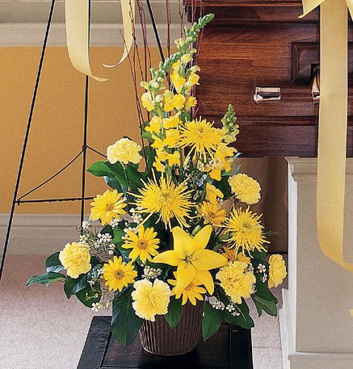 With its bright yellow flowers, this arrangement offers up a hopeful prayer. One arrangement arrives with yellow carnations, chrysanthemums, lilies and snapdragons in a simple container. Yellow flowers signify friendship and hope and offer a warm message of sympathy to the deceased and their family members.