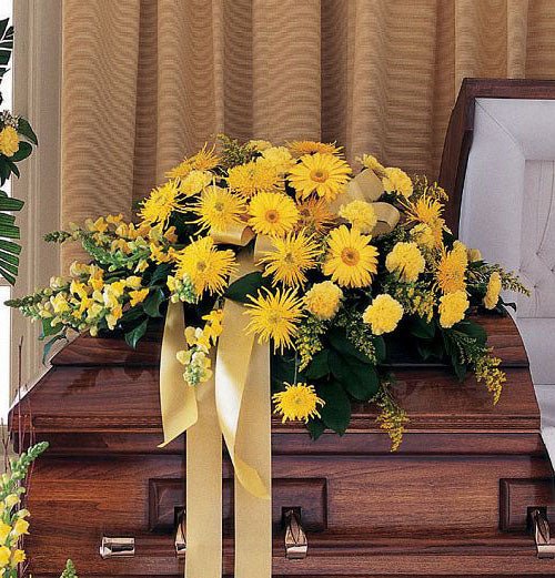 This traditional yellow casket spray reminds family and friends of all the bright and joyful memories. One half-couch casket spray arrives with yellow carnations, chrysanthemums, gerberas and snapdragons accented with cascading yellow ribbon. Makes a bright and vibrant remembrance for a loved one or family member's funeral services.