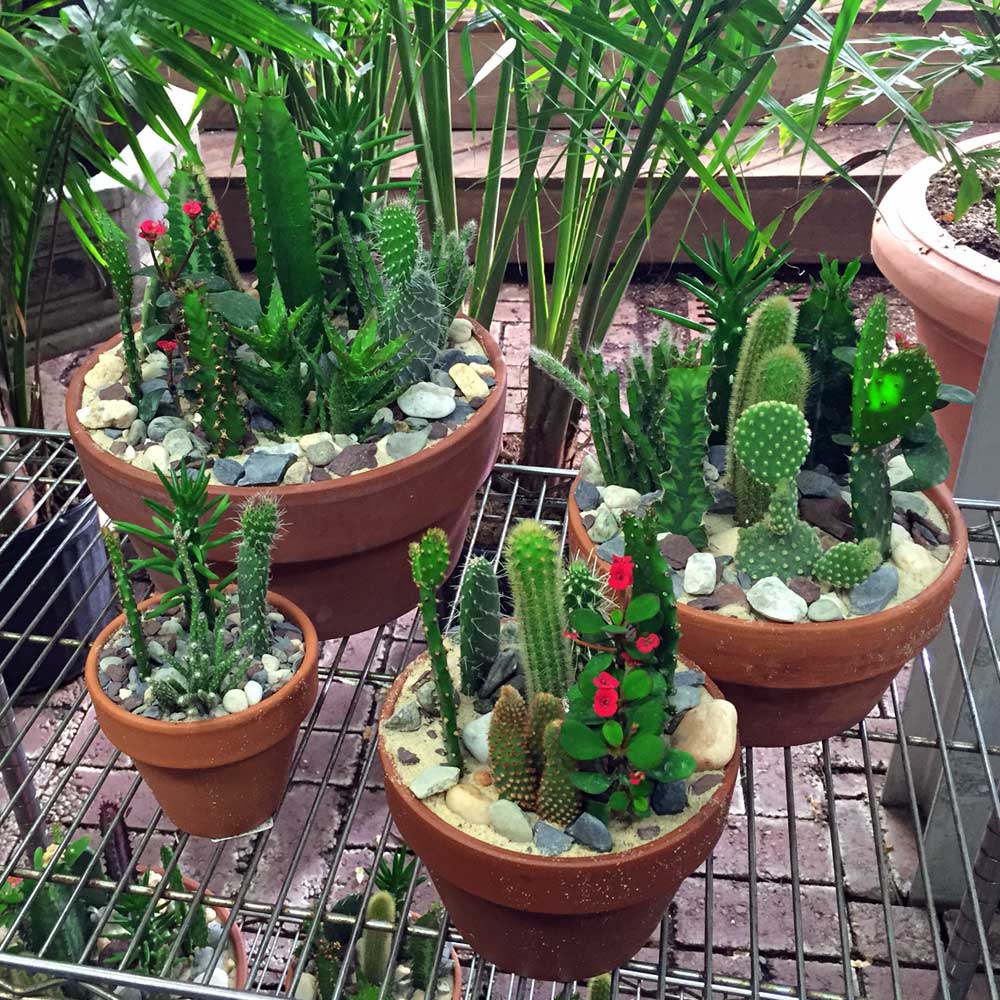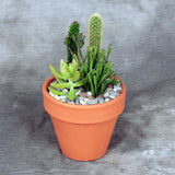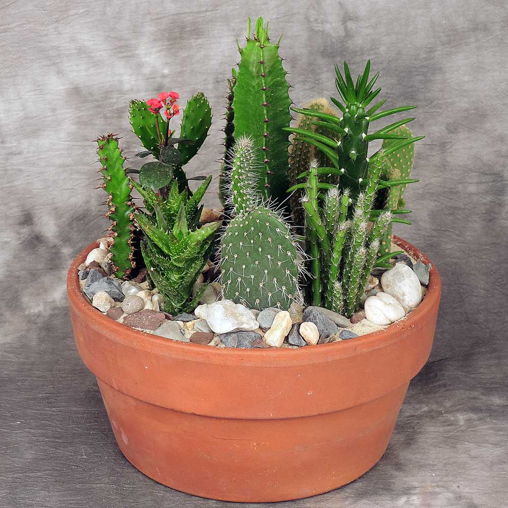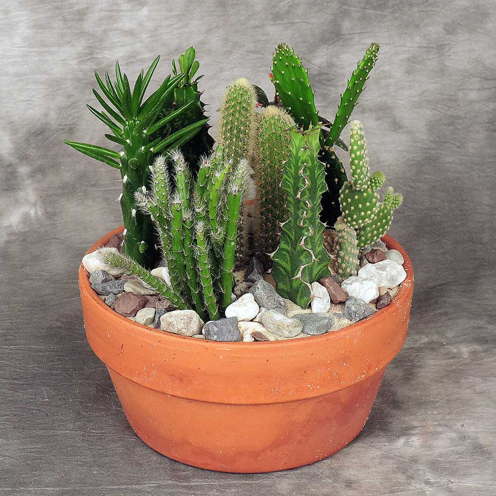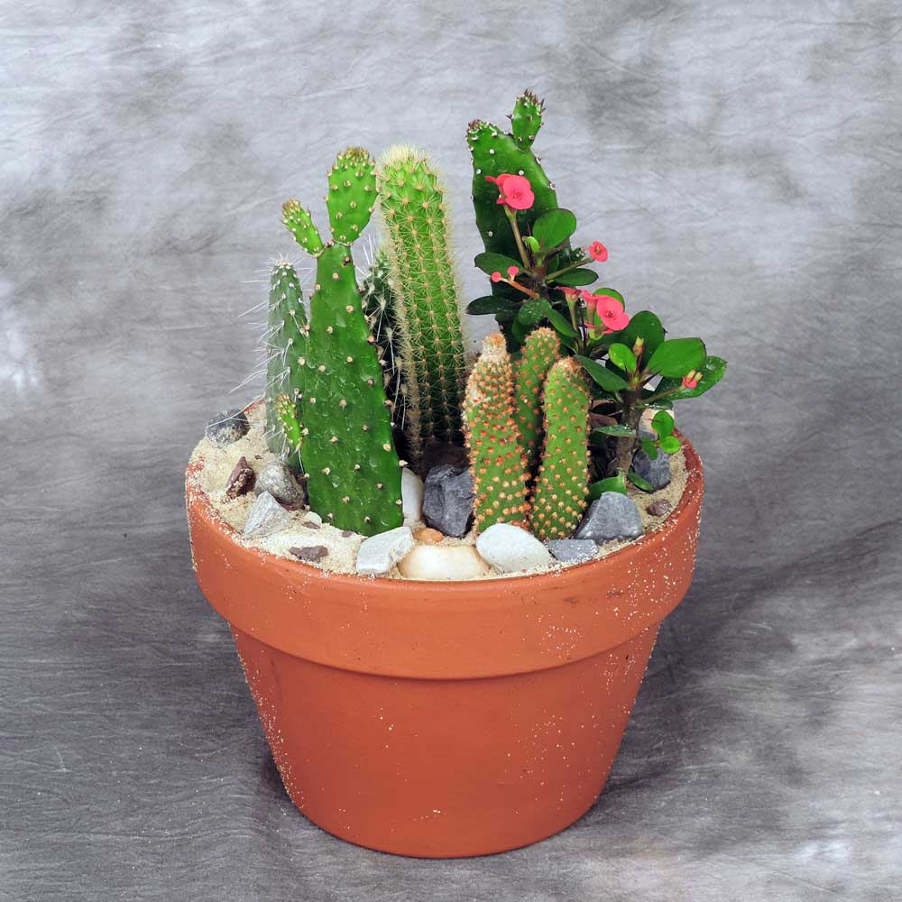 Perfect for any occasion! Send something a little different with this fancy cactus garden, a piece of the desert! Each planter is unique. They arrive in terra cotta pots with assorted stones, sand and a variety of cacti.