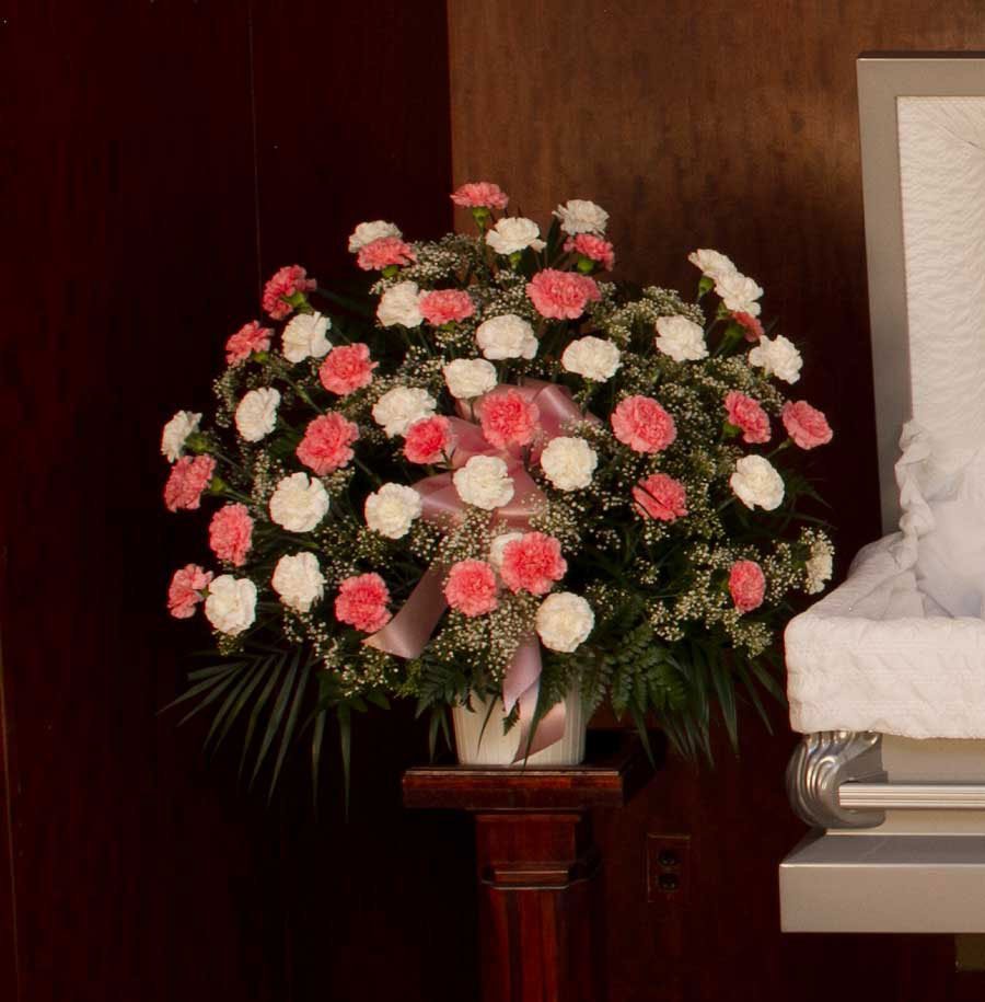 The Carnation Funeral Basket is top choice for both the head and foot side of the casket. This piece features beautiful, long lasting carnations with light babies breath, greenery and a satin bow. The carnation color can be customized if you'd like. Other than pink and white, we also have red carnations. Colors can be specified in the special instructions field during checkout.