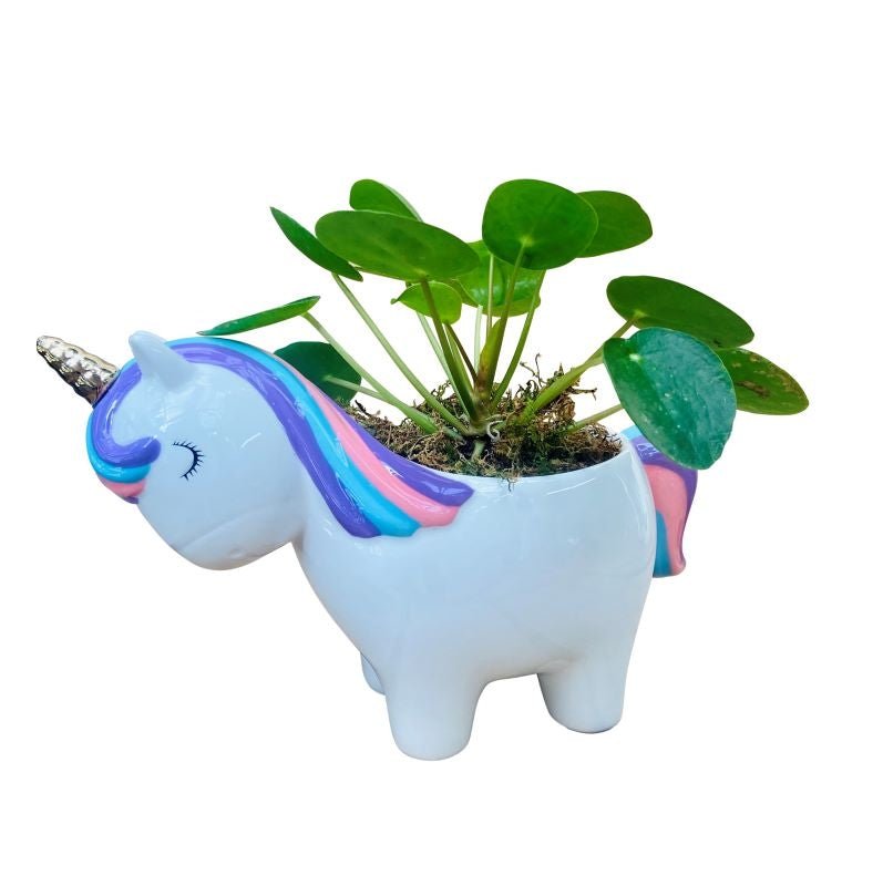A magical and enchanting display of plant beauty! This all-natural look features a lavish, growing pilea plant within a decorative and adorable ceramic unicorn planter. This unicorn features a beautiful, pristine white body and pink and blue mane. An excellent gift of celebration and originality, for every type of occasion all throughout the year.