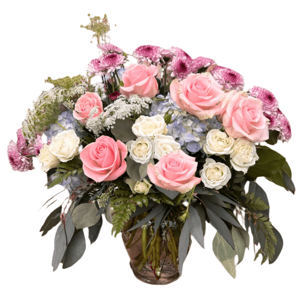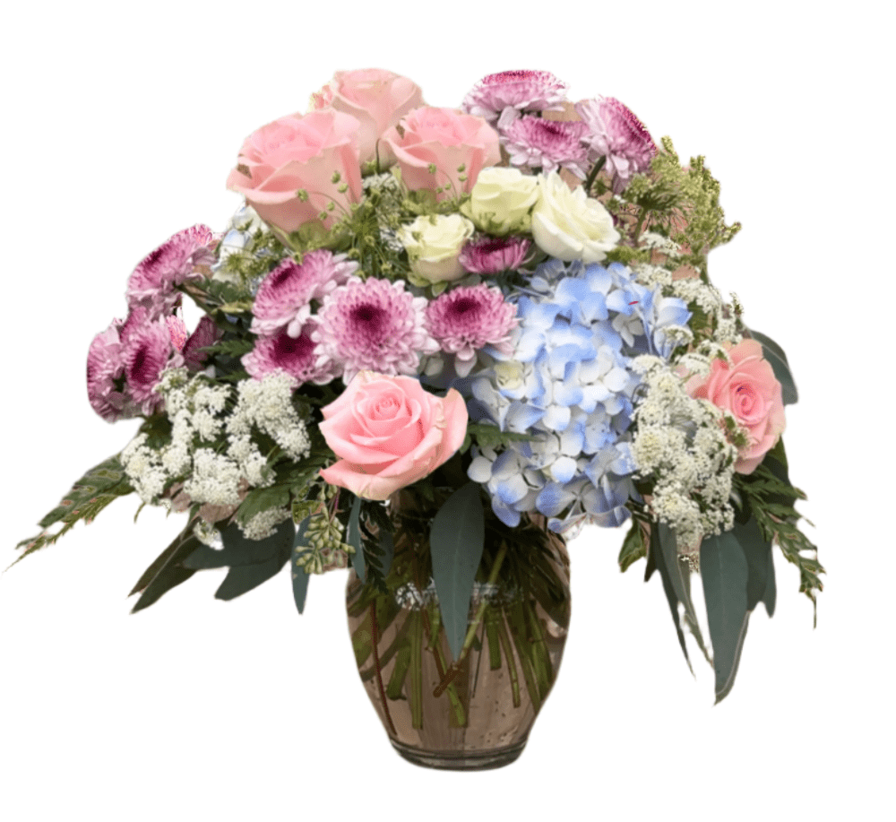 A charming glass vase arrangement filled with cheerful pink roses, white spray roses, blue hydrangea with whispy filler.