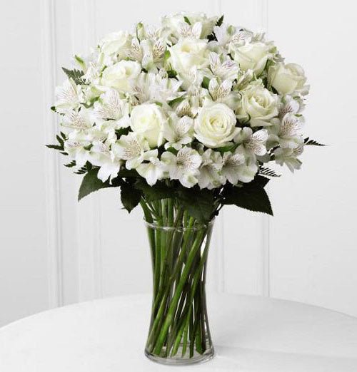 An elegant mix of pure white roses and cream colored Peruvian lilies arranged in a glass vase.