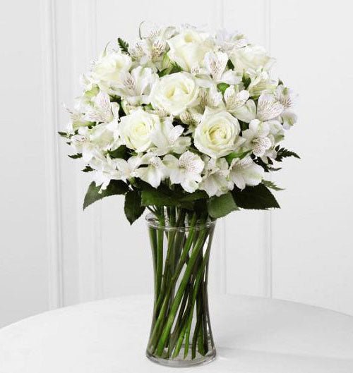 The Cherished Friend Bouquet offers comfort and sympathy in the time of grief and loss. Bright white roses and Peruvian lilies are accented by lush greens and gorgeously arranged in a clear glass gathering vase to create a bouquet that will bring peace and show how much you care.