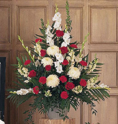 Your cherished moments were many and this arrangement displays that sentiment beautifully. One classic funeral arrangement arrives with white gladioli, chrysanthemums and snapdragons and red roses and carnations in a classic container. This arrangement is designed one-sided to maximize the floral display.