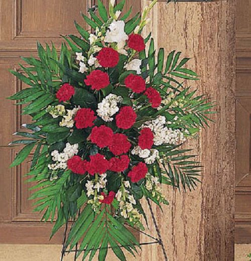 Traditional standing spray of red and white flowers with a blacking of greens for a funeral.