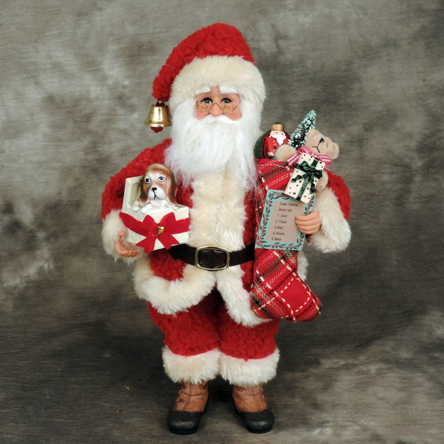 One of the most memorable moments of the holiday is the surprise Christmas morning when children first see all the presents, gifts and toys around the Christmas tree. This tabletop Santa captures that moment.