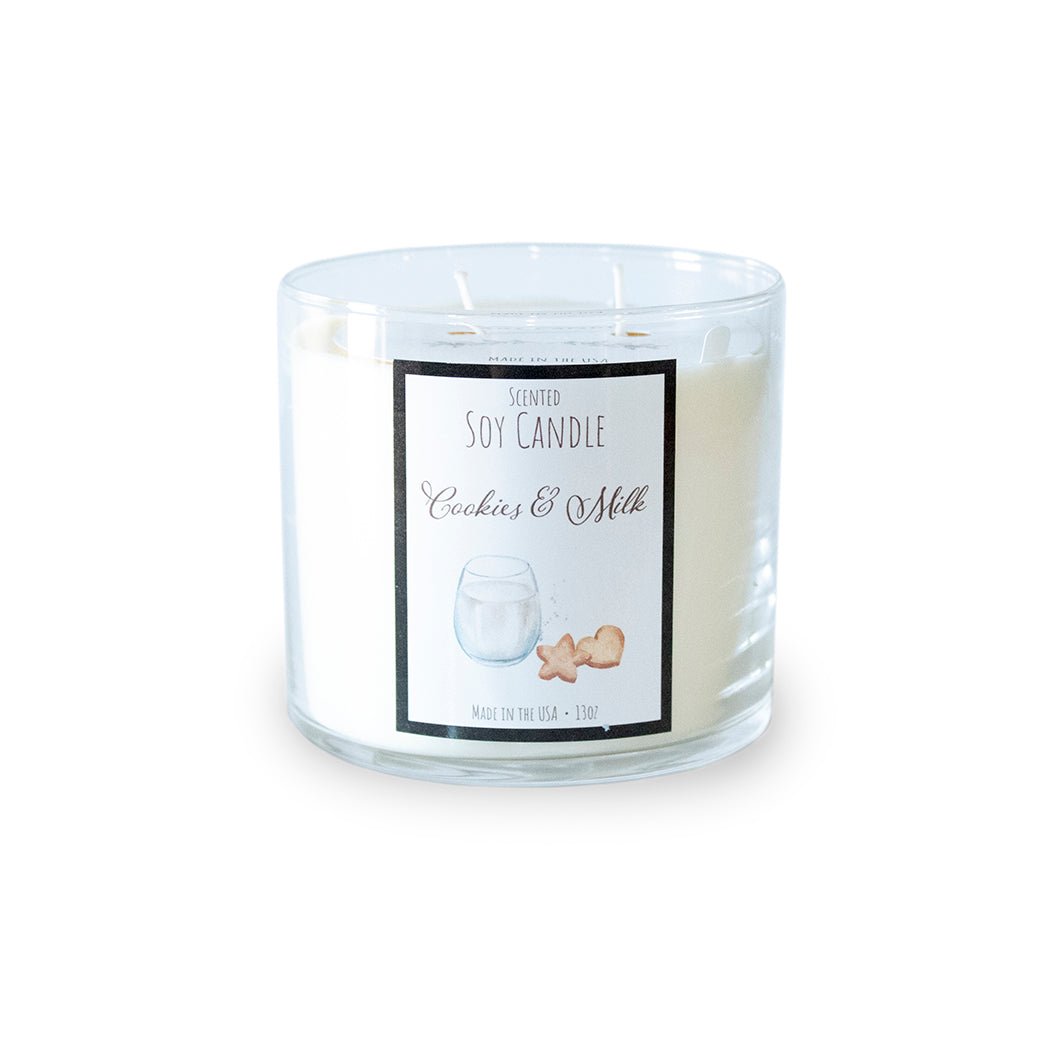 The Cookies and Milk candle is made with 13 oz of creamy soy wax and poured into a clear glass jar. The candle maker describes the fragrance as sugar cookies topped with buttercream icing and the prettiest colorful sprinkles. No snack of cookies would be complete without a cold glass of milk! The tasty dessert is pictured on the simple white label with beautiful cursive writing and illustration.