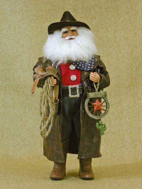 Giddy up! This fun Santa figure is ready for a Christmas out on the range. Santa comes decked out in a long leather duster, cowboy boots, hat, bandanna and rustic, south-western accents.