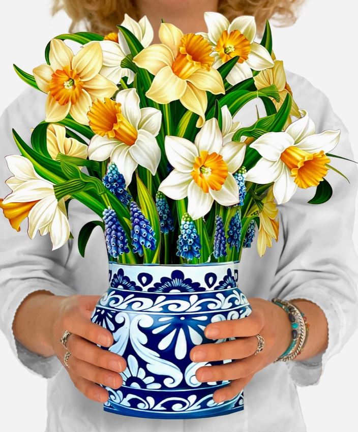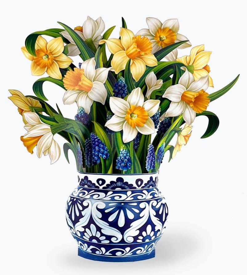 Cheerful yellow daffodils and blue grape hyacinths perfectly contrast each other on the Daffodils Greeting Card. The happy spring flowers come in a blue and white paper “vase.” With a blank note card included, this 3D card can be given for birthdays, thank yous, or any occasion.