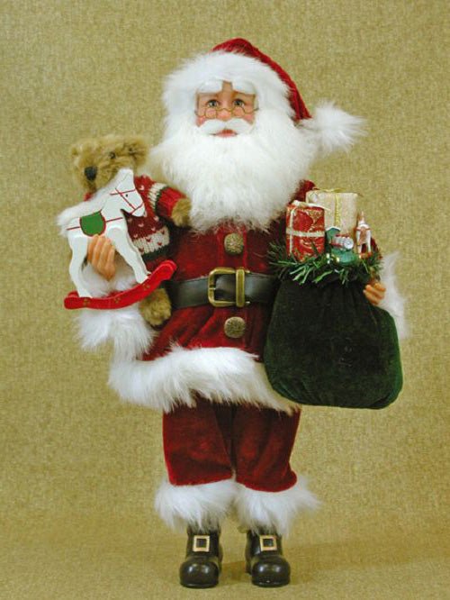 A great item to add to your favorite Aunt's Santa Claus figurine collection. This Santa comes in traditional red velvet suit with faux white fur trim with green sack of wrapped presents while holding a sweet teddy bear and rocking horse made by the elves.