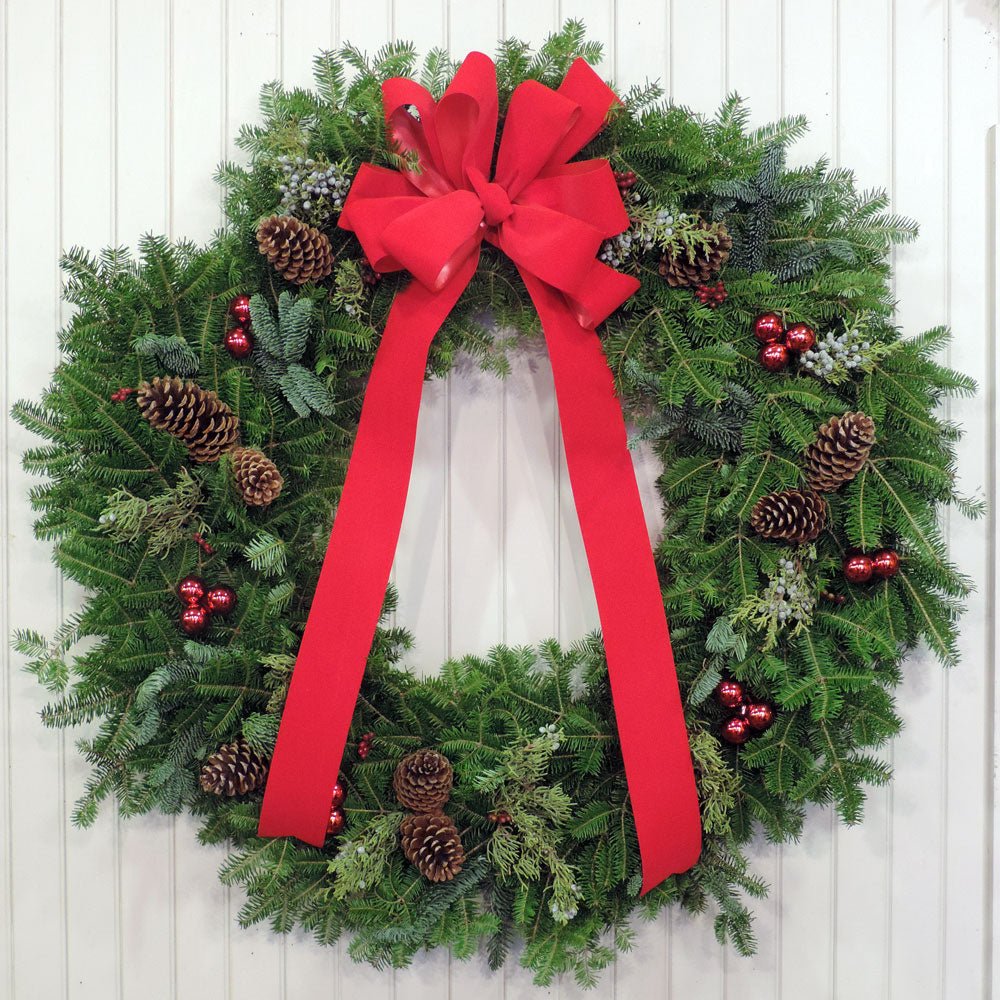 Decorated and fresh, this 32" diameter Mixed Green Wreath is the perfect sized wreath for larger spaces like garage doors, barn doors, sides of homes, etc. Features a beautiful red bow that is safe for all types of weather, pine cones, holiday balls, and assorted holiday greens.