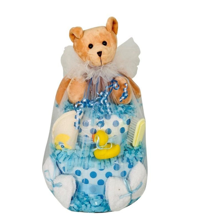 The Boy Diaper Cake is designed to provide the new parents or parents-to-be with some essential baby gear while also providing some fun gifts for the baby as well. Included within this sweet treat is an assortment of baby necessities like a blanket, diapers, wash cloths, teether, brush, comb, pacifier, and finished off with a plush bear topping! The originality and creativity of this baby themed selection definitely catches the eye of all who see and the heart of all who receive. A 3 tiered "cake" that is super sweet and super neat, even the babies will adore this original treat!