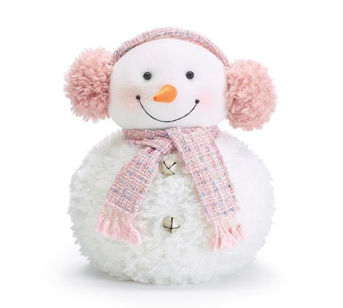 The Earmuffs snowman is smiling ear to ear beneath fuzzy pink earmuffs and a coordinating scarf. The snowman’s cute and round belly is adorned with shiny jingle-bell buttons and filled with sand so he will stay put atop your bed or amongst your winter decor. This gift can be displayed all season long!