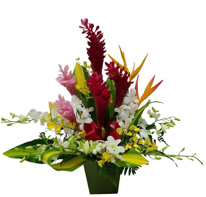 Turn up the tropical charm with the Exotic Celebrations Bouquet—a striking one-sided floral display that brings the heat of the islands right to their door. Featuring fiery red and pink ginger, elegant white dendrobium orchids, playful sprays of yellow oncidium orchids, dramatic bird of paradise, and lush tropical greenery, this arrangement is designed to stand tall and turn heads.