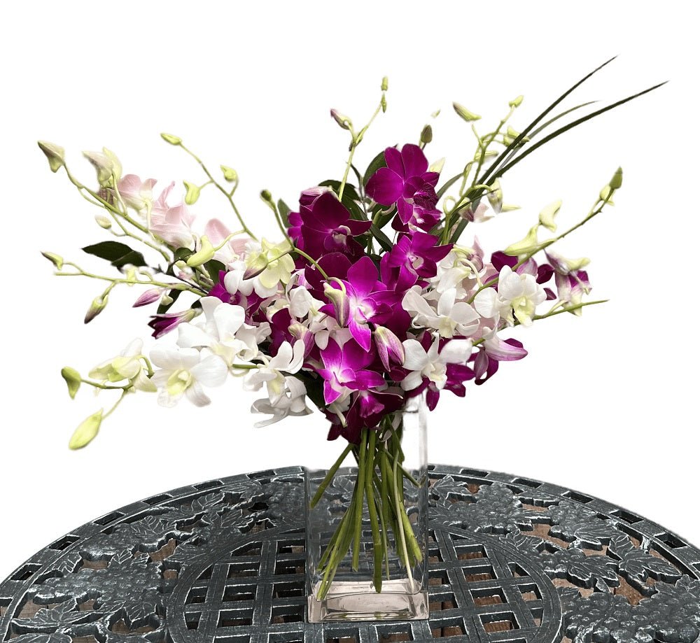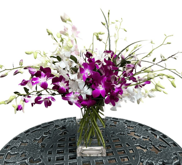 Dendrobium orchids are by far the most common orchid variety for use in flower arrangements. The stems aren't as long and bulk as some other varieties, they are readily available and they work great with other varieties of cut flowers. This particular bouquet is available in purple, purple and white or pure white.