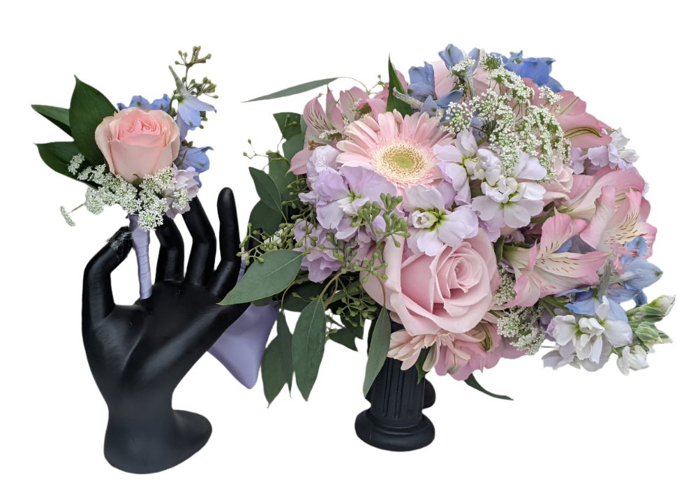 The Fairytale Prom Flower Package combines a gorgeous clutch flower bouquet and matching boutonniere.  Each are made with a variety of pastel flowers. The bouquet may include blooms like roses, mini gerbera daisies, stock, alstroemeria, delphinium, and queen anne’s lace. The bouquet is accented with trailing greenery and finished with a satin ribbon. The pastel colors and garden look create a fairytale feeling of magic and enchantment.