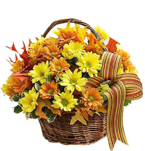 Our favorite Fall Daisy Basket!Beautiful buds of daisies with Fall accents and bow in a basket.