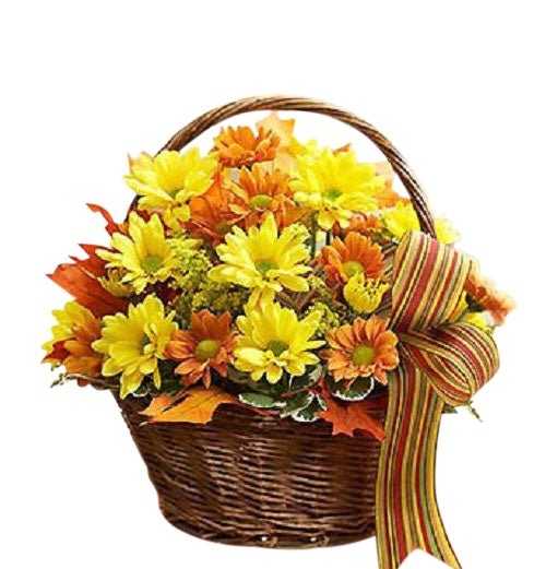 Bring back memories of childhood days picking flowers when you send this charming arrangement of fresh yellow and bronze daisies, hand-designed in a rustic handled basket. Equally at home as a centerpiece or to add smiles to an Autumn birthday, anniversary or housewarming.