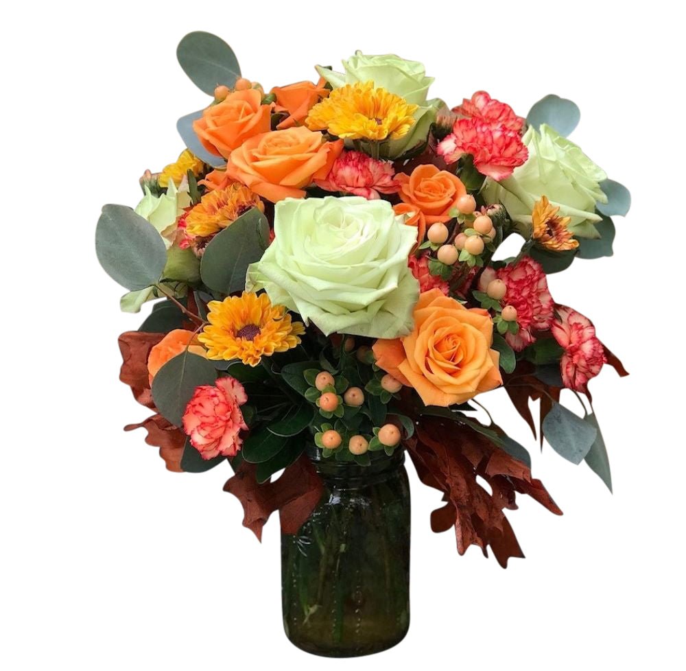 Our customers love this arrangement because it reminds them of the recipient favorite and Kremp Florist exclusive - Mom's Mason Jar Bouquet! It's the perfect size for any table or desk top, while also incorporating the beauty of fresh cuts and festiveness of the Fall Season! This is definitely a selection that you can't go wrong with.
