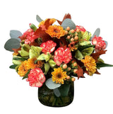 Our Fall Radiance is the arrangement that will be the talk of the season! The fall brilliance of this design will radiate throughout any environment with a positivity and beauty that is incomparable. Vibrant oranges, reds, and pastel greens will be popping with style and grace while incorporating a fresh, festive feel into your atmosphere. Blooming florals such as roses, spray roses, mini carns, and viking mums are beautifully paired with elegant greenery, such as eucalyptus, and silk fall accents like, burgundy dried leaves, to create an artist display of Autumn radiating throughout your recipient's home or office space. This is the perfect selection for any recipient on any occasion with its unique seasonal color pallet and luscious floral assortment.