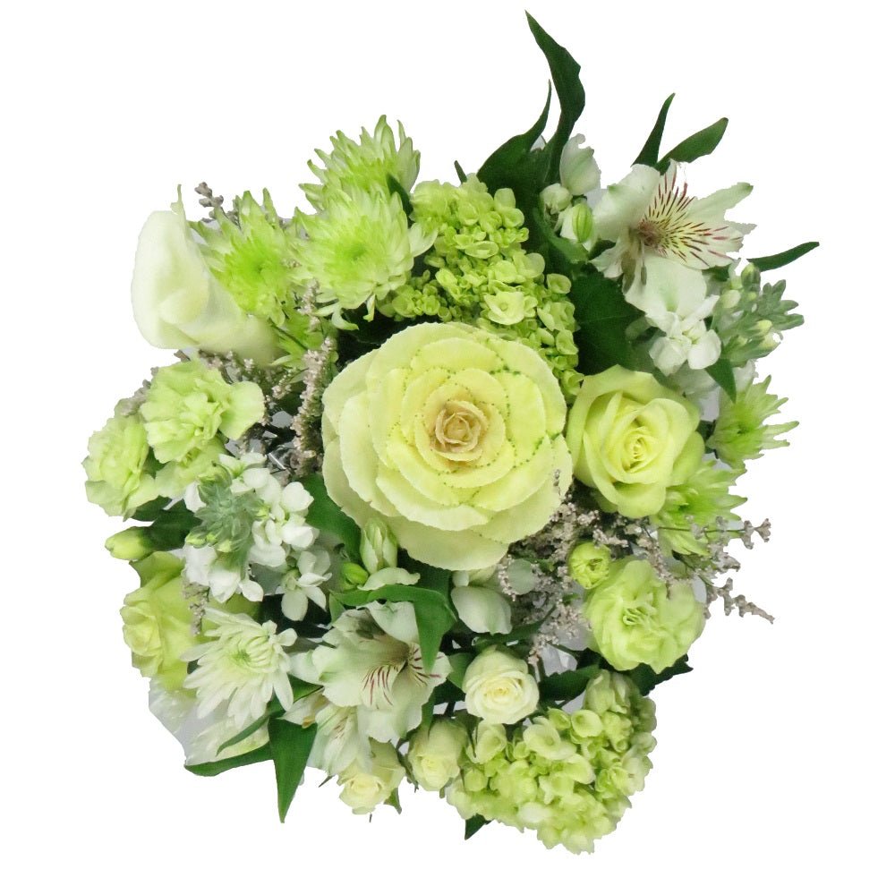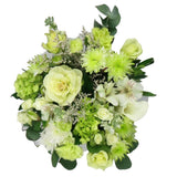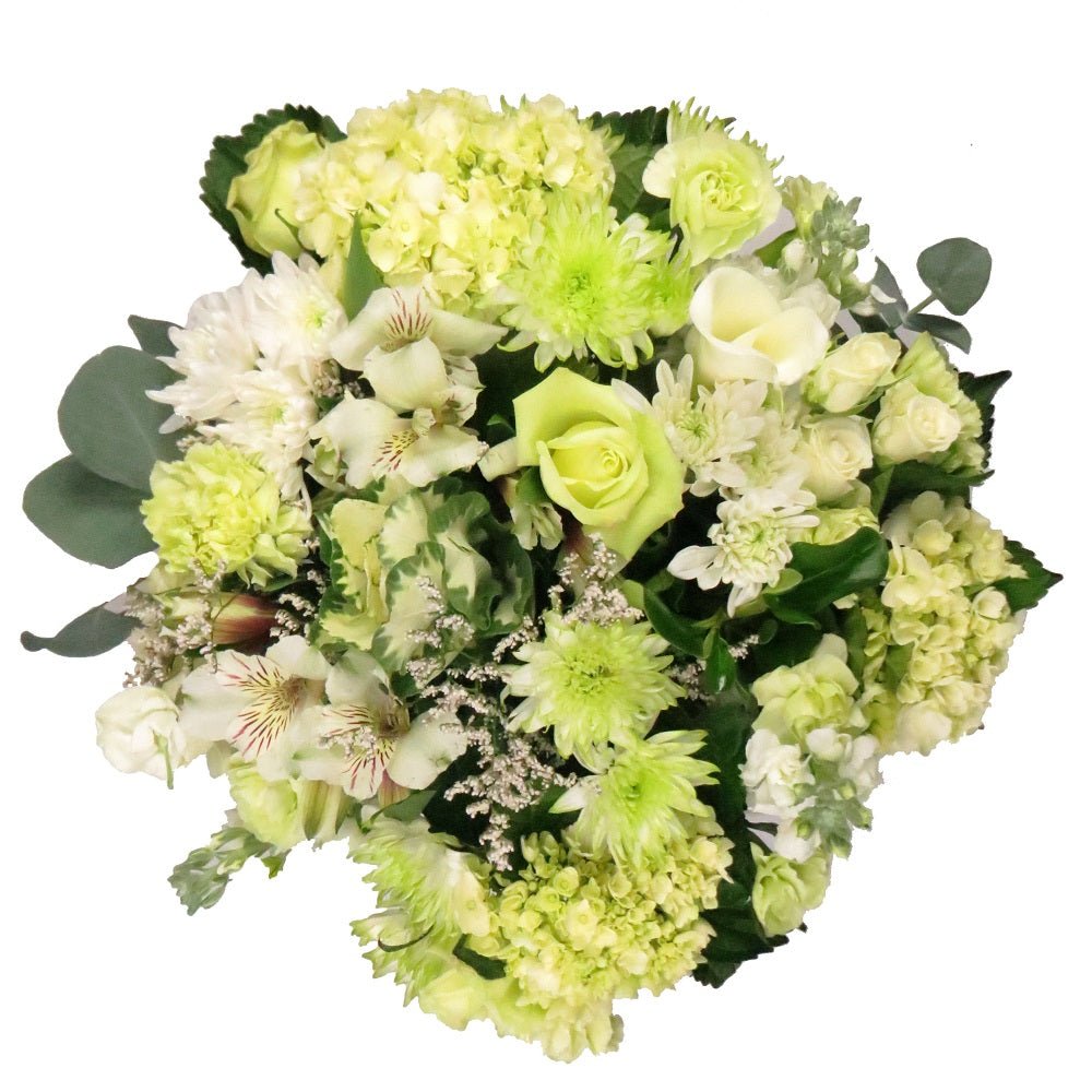 Our White Feel Special Bouquet is an artistic display of naturalistic beauty and earthy style! This brilliant combination of pure ivories and lime greens explodes with a breathtaking expression of charm, cheer and grace. Each stem is hand-selected by our top designers to create an extravagantly rich wrapped bouquet. Striking in complementing color and captivating in dimension, this garden-fresh bouquet has a way of expressing more than just beauty and style, but also the perfect message for any and all occasions! The perfect bouquet for a special birthday, anniversary, or celebration as well as occasions of sympathy or illness, as it projects the perfect celebratory, comforting and cheerful presentation of vibrance, life, and originality. With assorted, seasonal flowers like roses, hydrangea, alstroemeria, stock, mums, and more- your recipient will not only feel your friendship, love, and appreciation but also feel special!