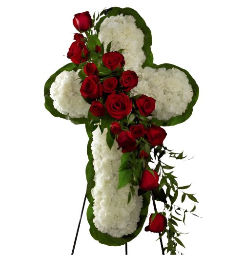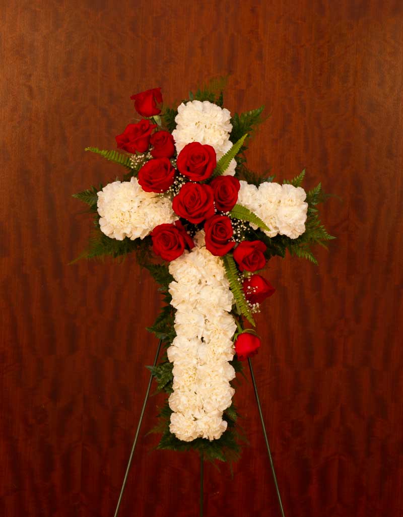 The Floral Cross Easel is symbolic of love and faith to honor the deceased at their final farewell service. White carnations are arranged to form a cross in which an accent of red roses, spray roses, and lush greens are draped across the center, creating a beautiful display of serene elegance. Displayed on a wire easel.