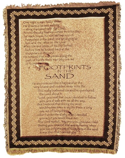 This beautiful keepsake sympathy throw blanket is a great way to express your feelings to someone in grieving. The very popular "Footprints" poem is woven into the fabric of the throw blanket to offer a message of consolation to the person who receives it.
