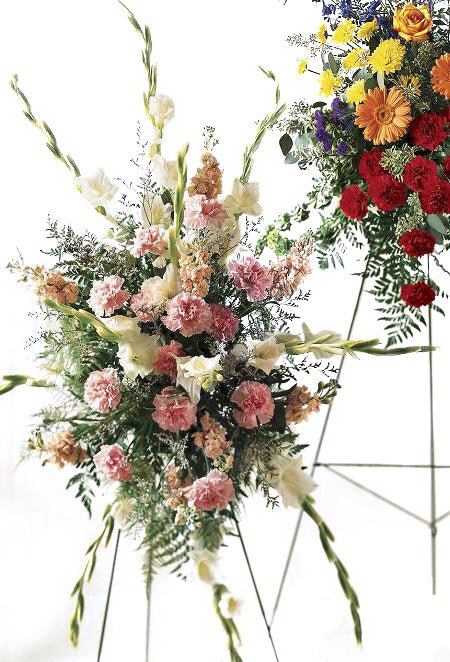 This FTD standing spray is a glorious display of pink and white flowers to send your sincere condolences. This beautiful piece incorporates white gladiolus, pink carnations and light pink stock intermixed with delicate limonium and lush greens. A truly elegant and beautiful tribute piece. Arrangement is delivered with an easel for display.