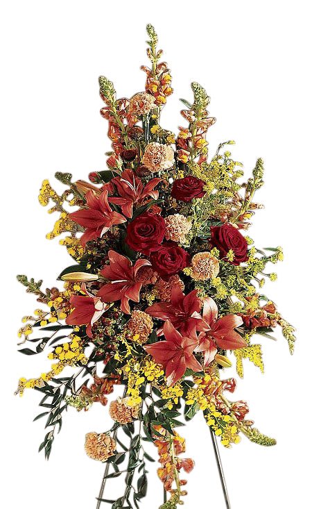 A lovely sentiment at a difficult time. This spray stars gorgeous rust-colored lilies and red roses surrounded by yellow oncidium orchids, snapdragons, spray roses, and other varieties of lush blooms in shades of red, orange and yellow. This arrangement is delivered on an easel.