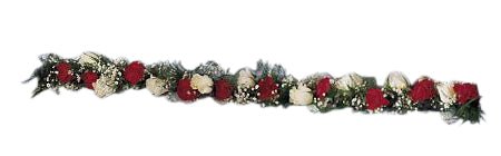 This elegant hinge piece adds just a delicate floral touch inside the casket. Gorgeous white flowers contrast with red flowers and are woven into Monte Casino and baby's breath to form a delicate garland. This personal tribute embellishes the inside of the casket along the hinge adding a touch of beauty to their farewell services.