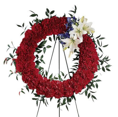 This red, white, and blue flower standing spray arrangement is a patriotic expression of respect and sympathy for a lost loved one. This sympathy wreath hosts a solid ring of bright red carnations accented with fragrant white lilies and blue delphinium, with delicate greens. This piece is perfect to honor a loved one's service in the military. This funeral wreath arrangement is delivered on an easel for display.