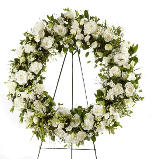 The FTD Splendor Wreath is an elegant white wreath arrangement perfect to send in memory of or to comfort the family of a loved one. Fragrant white freesia, double lisianthus, spray roses, Monte Casino asters and limonium are accented with a variety of lush greens and green raffia ribbon in an elegant wreath form. This arrangement arrives with an easel for display.