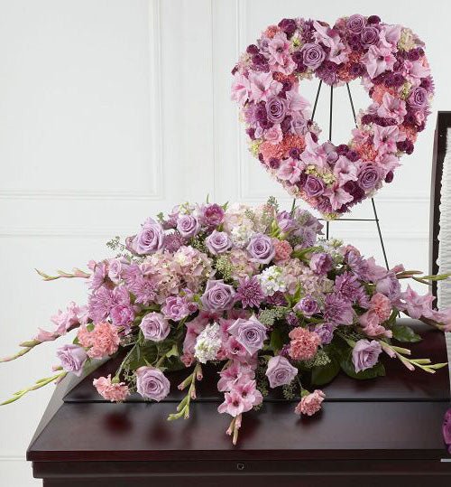 A 2 piece funeral flower package made up of pastel pinks and purples. The casket spray and heart make a showy statement together.