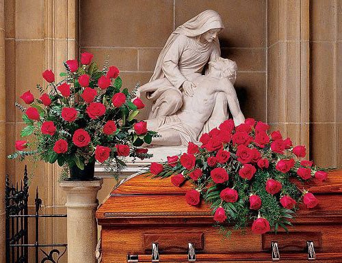 Our deluxe red rose funeral flower package at a discount!Beautiful red roses in a casket spray and funeral basket.
